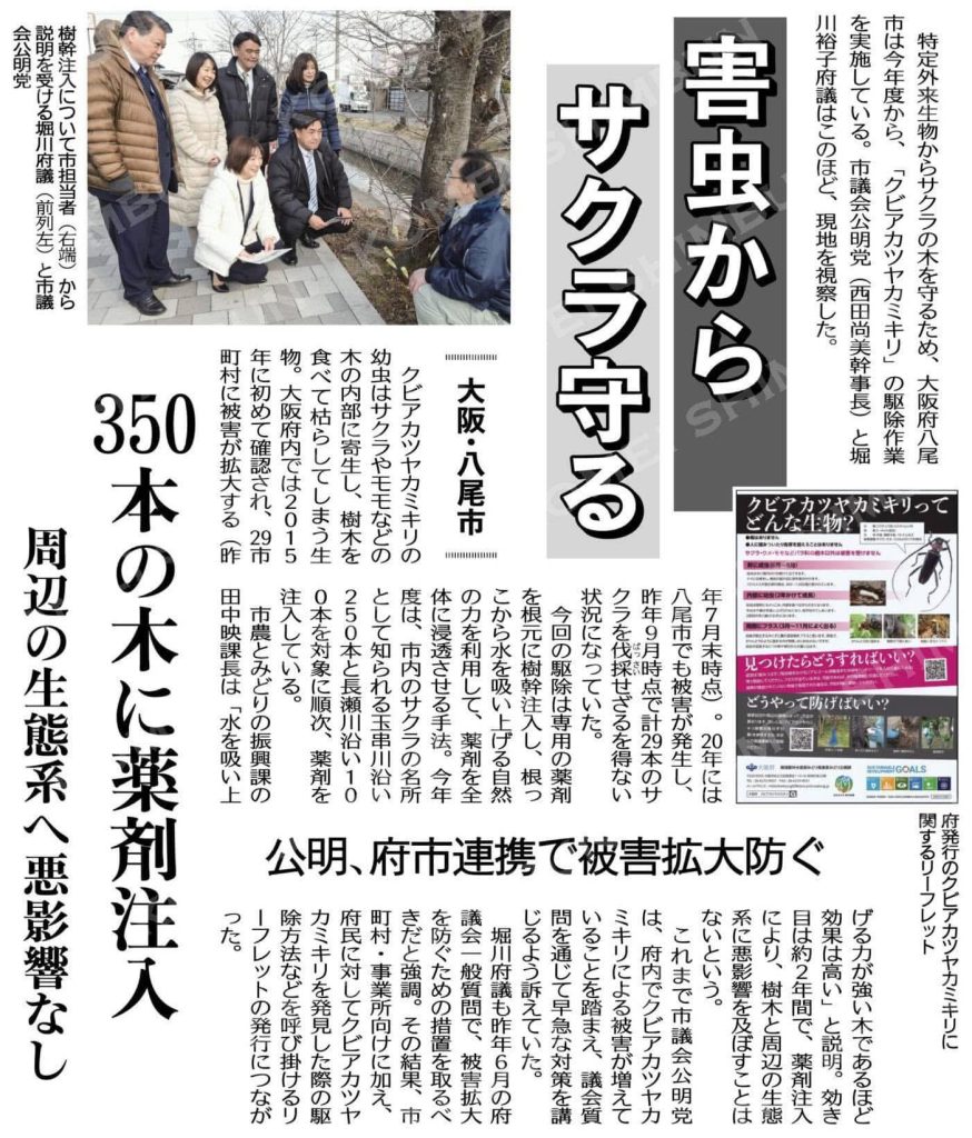 2月 25 2025 0 特定外来生物「クビアカツヤカミキリ」による桜の被害について、令和2年より単独で調査を始め、生息範囲の拡大状況について近隣の自治体を含めて注意を促して参りました。 八尾市においても具体的な対策が急務であることを議会質問を通して訴え続ける中で、令和6年度の予算で初めての対策予算を確保、令和7年2月に、薬剤の樹幹注入による駆除作業を実施することができました。 八尾市民の心とも言える大切な桜を守るために、今後も警戒を怠らず、継続的な防除作業を行なってゆくよう、八尾市に求めています。 投稿ナビゲーション 過去の投稿前 いじめ防止アプリを全校導入!次の投稿次 「大和川わんど」復活を!